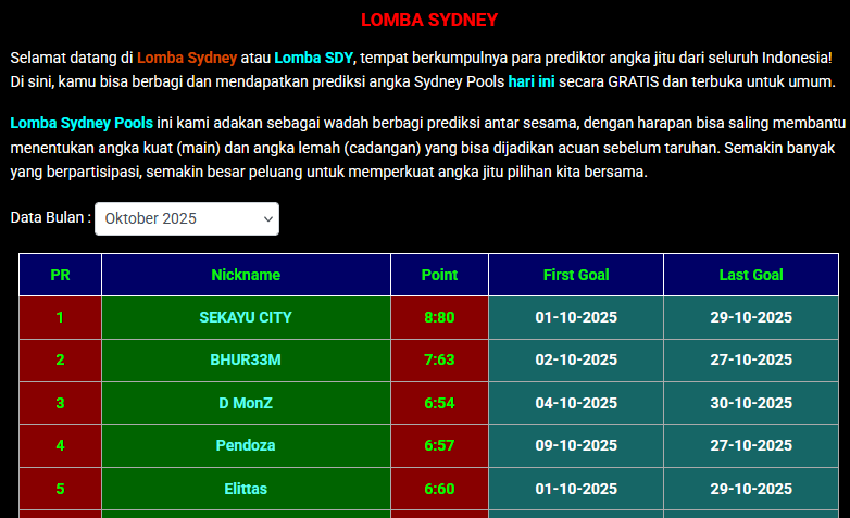 Selamat datang di Lomba Sydney atau Lomba SDY, tempat berkumpulnya para prediktor angka jitu dari seluruh Indonesia! Di sini, kamu bisa berbagi dan mendapatkan prediksi angka Sydney Pools hari ini secara GRATIS dan terbuka untuk umum.