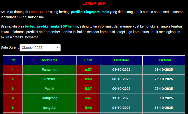 Di sini, kita bisa berbagi prediksi angka SGP hari ini, saling tukar informasi, dan memperkuat kemungkinan angka tembus lewat kolaborasi prediksi antar member. Lomba ini bukan sekadar kompetisi, tetapi juga komunitas untuk meningkatkan akurasi prediksi bersama.